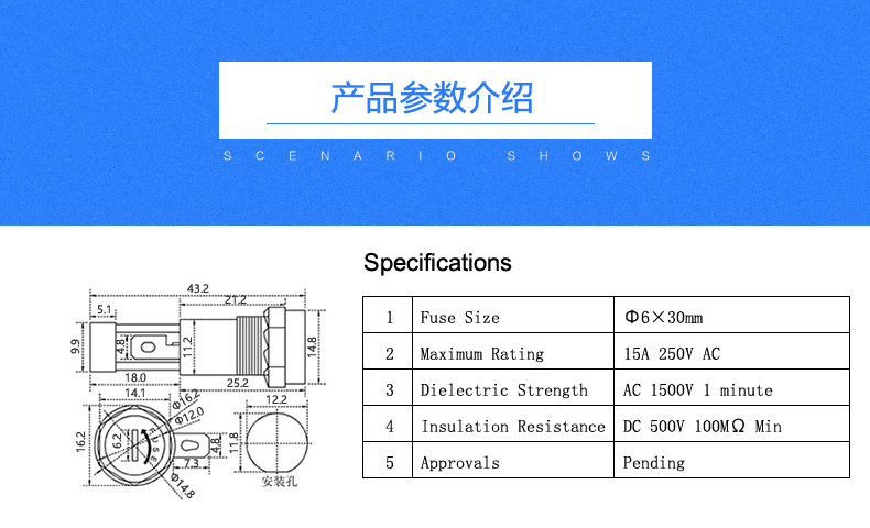 电流:15A 电压:250V 尺寸6*30规格